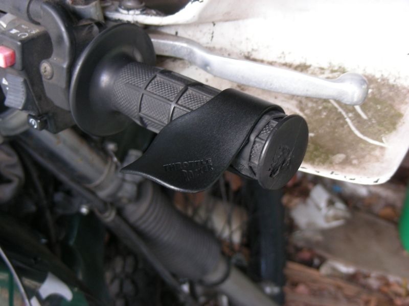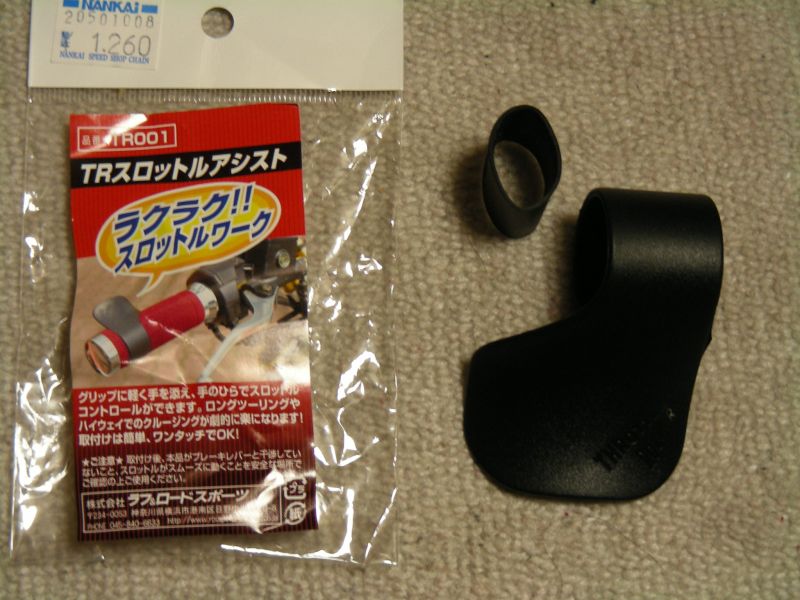 | 5月の一泊ツーリングで おぼかたさん と ながさわさんが付けていた、「スロットルアシスト」(アクセルに付けるレバー)を購入しました。 手のひらで押えるだけで アクセルを固定する事ができます。 |